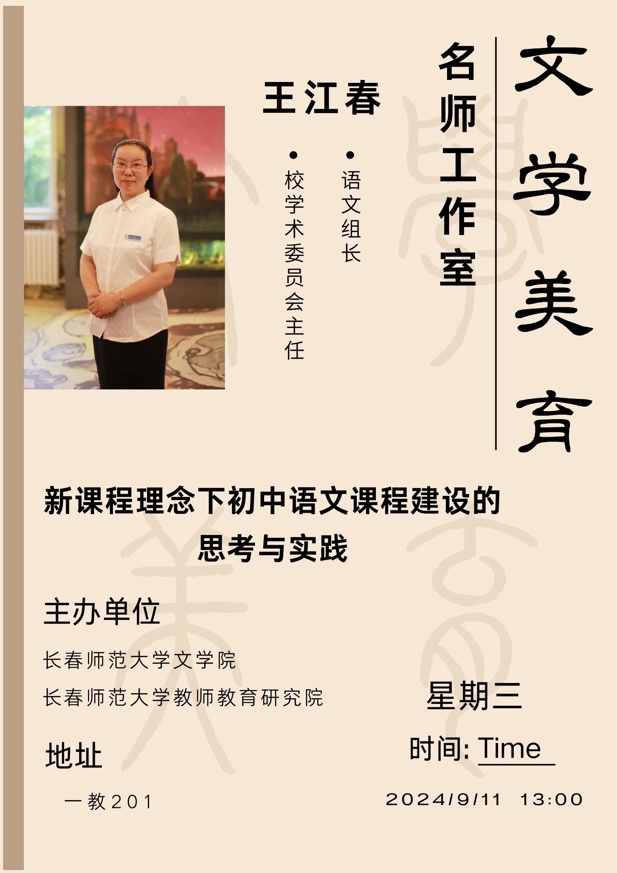 王江春,长春南湖实验中学语文组组长,校学术委员会主任。