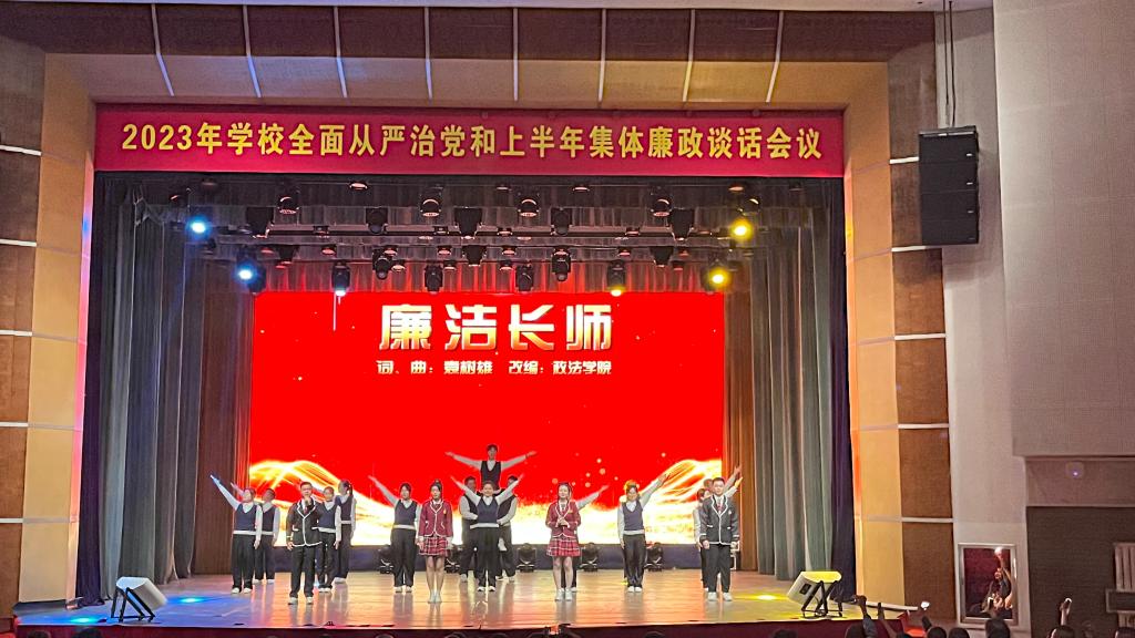 开场歌舞《祖国颂》,以昂扬的旋律,震撼的视觉冲击每个人的心房。朗诵《少年中国说》尽展中国少年磅礴的力量;《为廉洁放歌》缓缓演绎坚定的初心,那不曾改变的使命和共同追求的理想,全场观众起立朗诵铮铮廉洁誓言。舞蹈《万疆》感悟廉洁之路,与清风相伴,与初心相随;政法学院改编的手势歌舞《廉洁长师》燃爆现场,表达了长师学子对清风长师的深爱之情。小品《坑》告诫大家要守住廉洁自律底线,切勿做“躺平式”干部。以廉律己,以洁明志,不忘初心,方得始终,最后,在歌舞《不忘初心》中,廉洁文化文艺汇演落下帷幕。