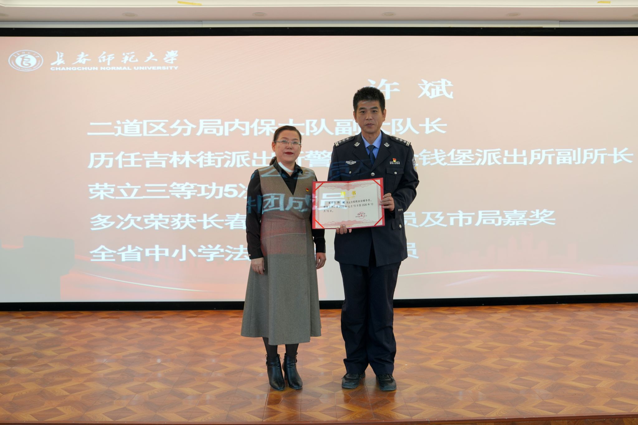按照《关于推进公安民警兼任法治副校长法治辅导员的指导意见》要求,长春市公安局二道区分局为我校配备了6名经验丰富、业务能力强的法治辅导员。陈爱梅为法治辅导员颁发聘书。