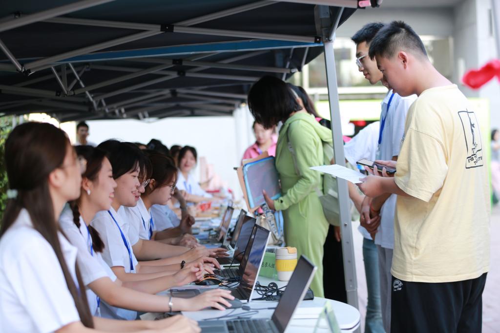 在经济管理学院迎新点前,新生辅导员刘江说:“学院制作了由全体新生姓名组成的姓名墙‘欢迎新同学’,青春、喜庆,让新生和家长直观的感受到欢迎和期许,留下专属于经管学子的迎新记忆。希望全体新生与2027年的自己来个青春的约定,在未来大学四年的时光里找到更好的自己。”