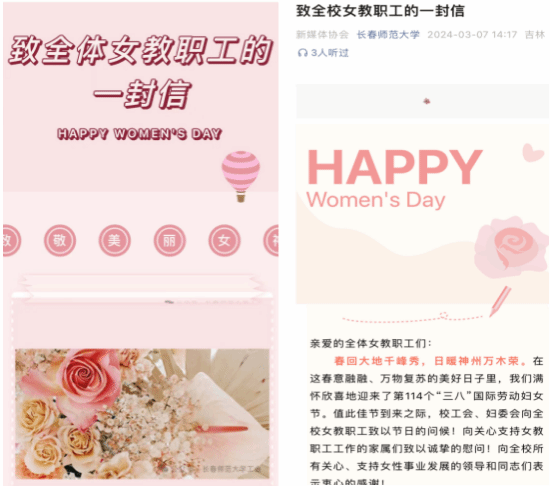 “春回大地千峰秀,日暖神州万木荣。在这春意融融、万物复苏的美好日子里,我们满怀欣喜地迎来了第114个“三八”国际劳动妇女节。值此佳节到来之际,校工会、妇委会向全校女教职工致以节日的问候!”这是一封来自学校对全校女教职工的节日慰问信,对在各自岗位上以新时代女性的风貌,巾帼建功、无私奉献、尽职尽责、勤奋工作的全体女教职工致以节日的问候和美好的祝愿。