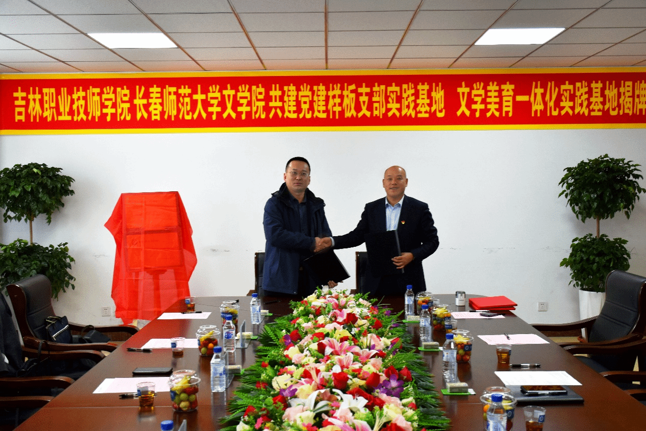 3月14日,我校文学院与吉林职业技师学院共建“实习+就业”基地、“党建工作样板支部培育创建单位”实践基地、“文学美育一体化”实践基地的签约及授牌仪式在吉林职业技师学院圆满举行。