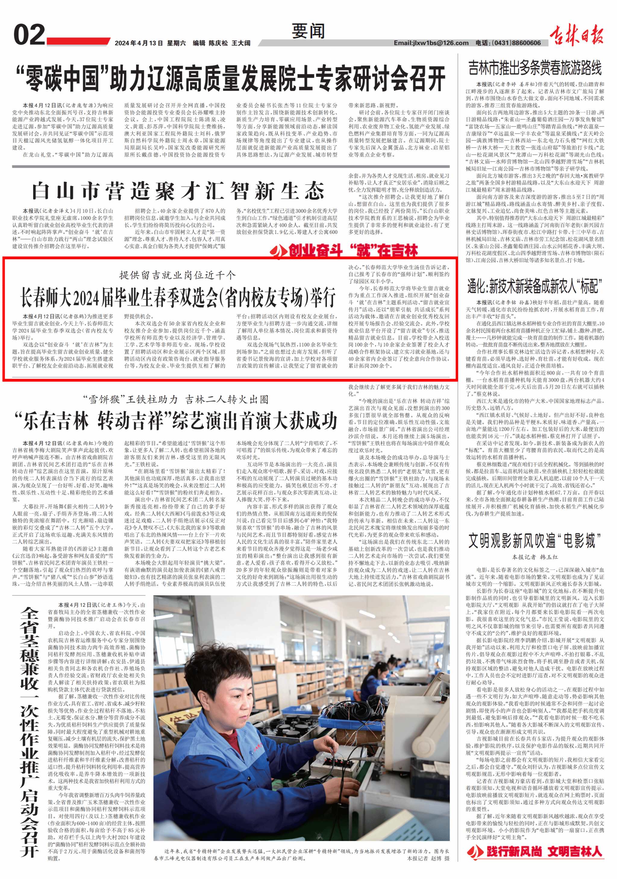 近日,由我校举办的长春师大2024届毕业生春季双选会(省内校友专场)在《吉林日报》“创业奋斗 ‘就’在吉林”专栏、吉林新闻联播、吉林广播电台、中国吉林网等多家媒体相继进行报道。