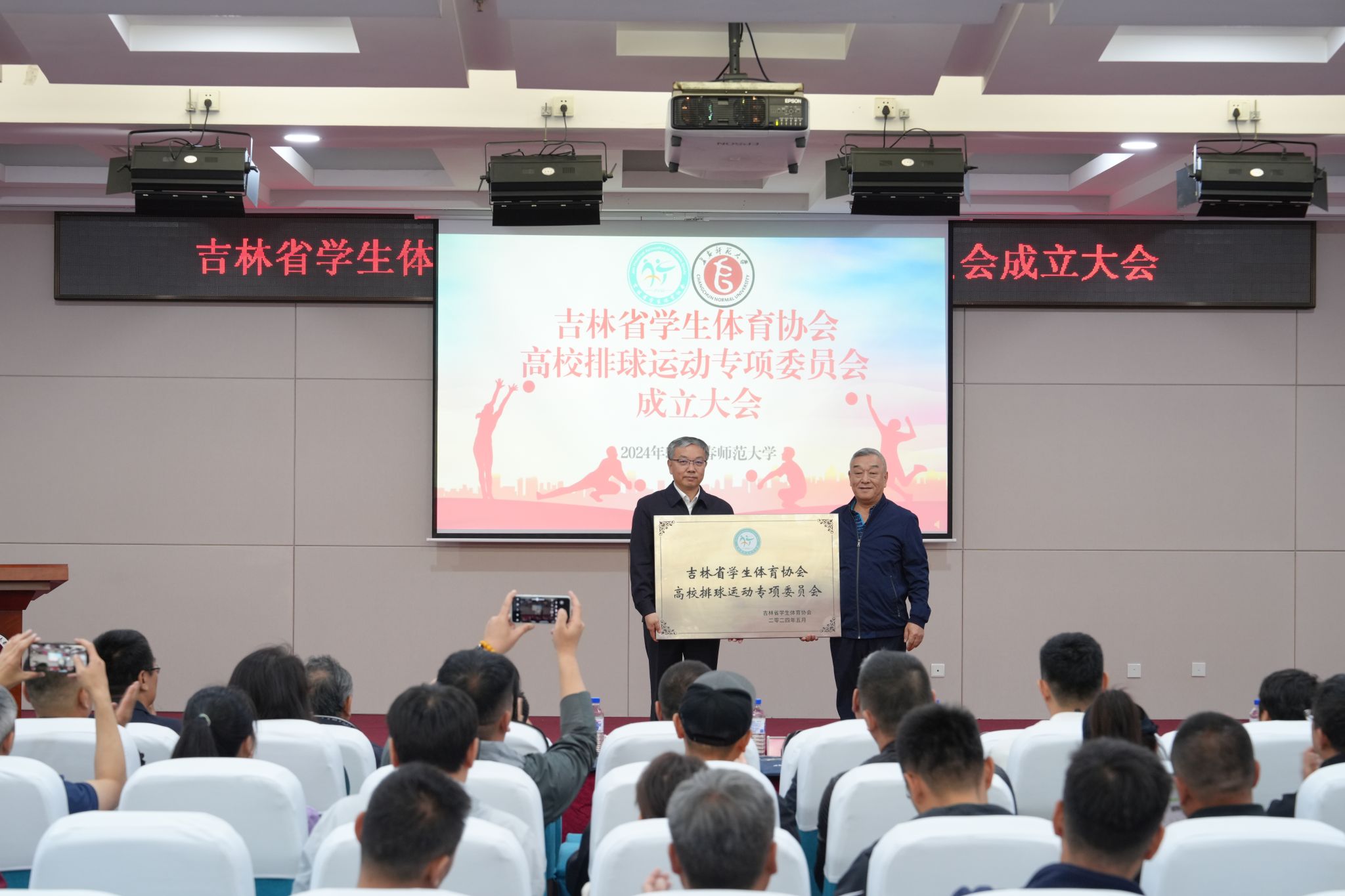 曲跃年宣读吉林省学生体育协会高校排球运动专项委员会成立的决定,并为我校授牌。