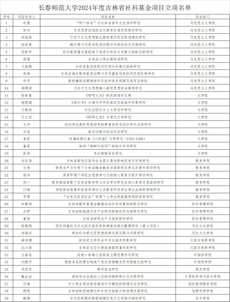 2024年度,我校共获批39项吉林省哲学社会科学基金规划项目,较去年立项数增长6项,增长率为18%。按吉林省哲学社会科学基金规划办公室近期公布的立项名单统计,我校立项数量居全省高校第三。其中,重大项目1项,一般自选项目13项,博士和青年扶持项目17项,基地项目3项,思政研究专项1项,其他各类专项合计4项。