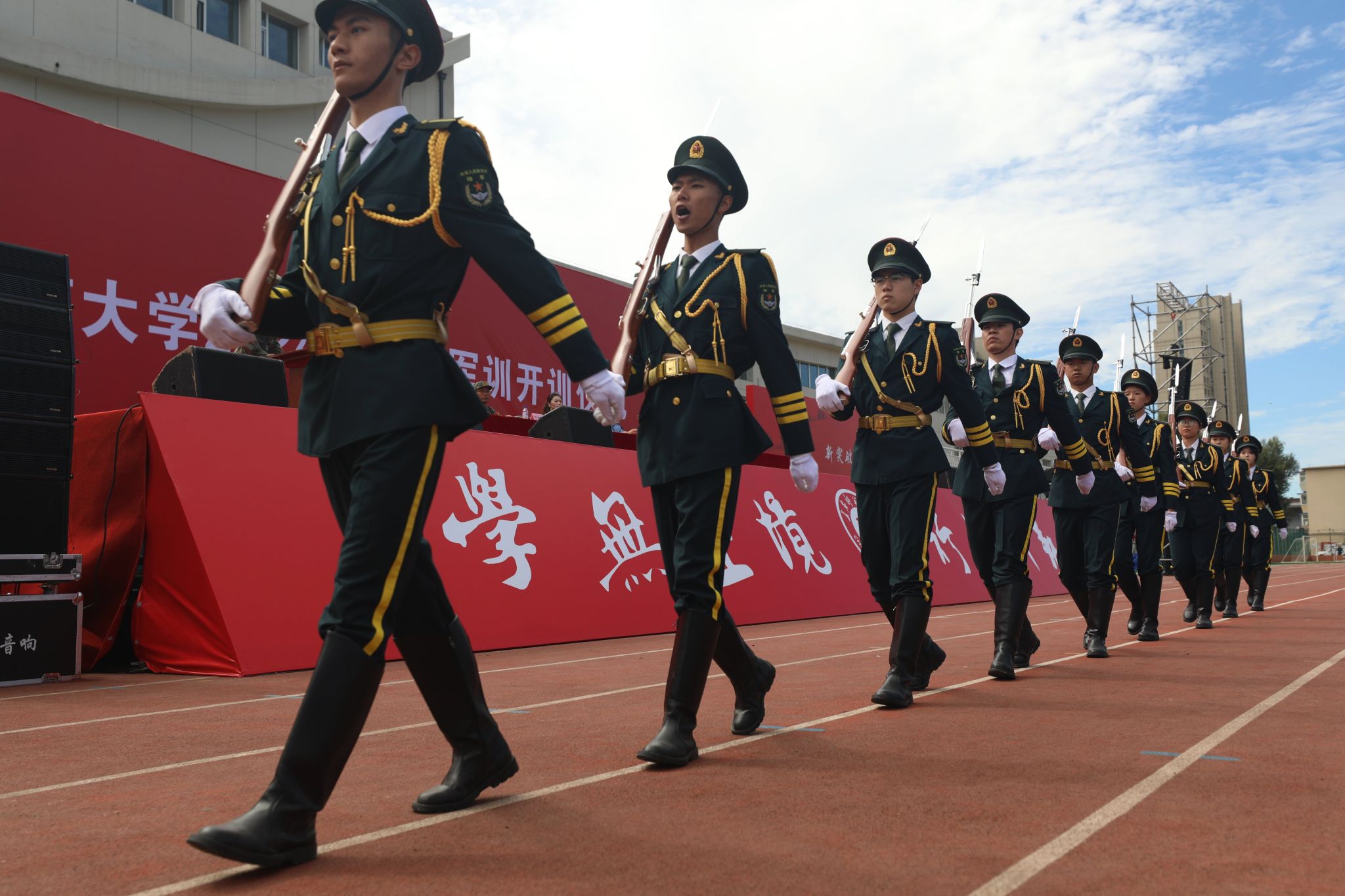 学校国旗护卫队昂首挺胸,阔步向前,展示着长师青年以青春热血,护国旗荣光的傲然风貌。承训教官步伐整齐、口号响亮,身姿挺拔地进行队列展示。“严格训练,严格要求,服从指挥,听从命令……”全体参训学生整齐划一举起右拳庄严宣誓,浑厚有力,响彻校园。