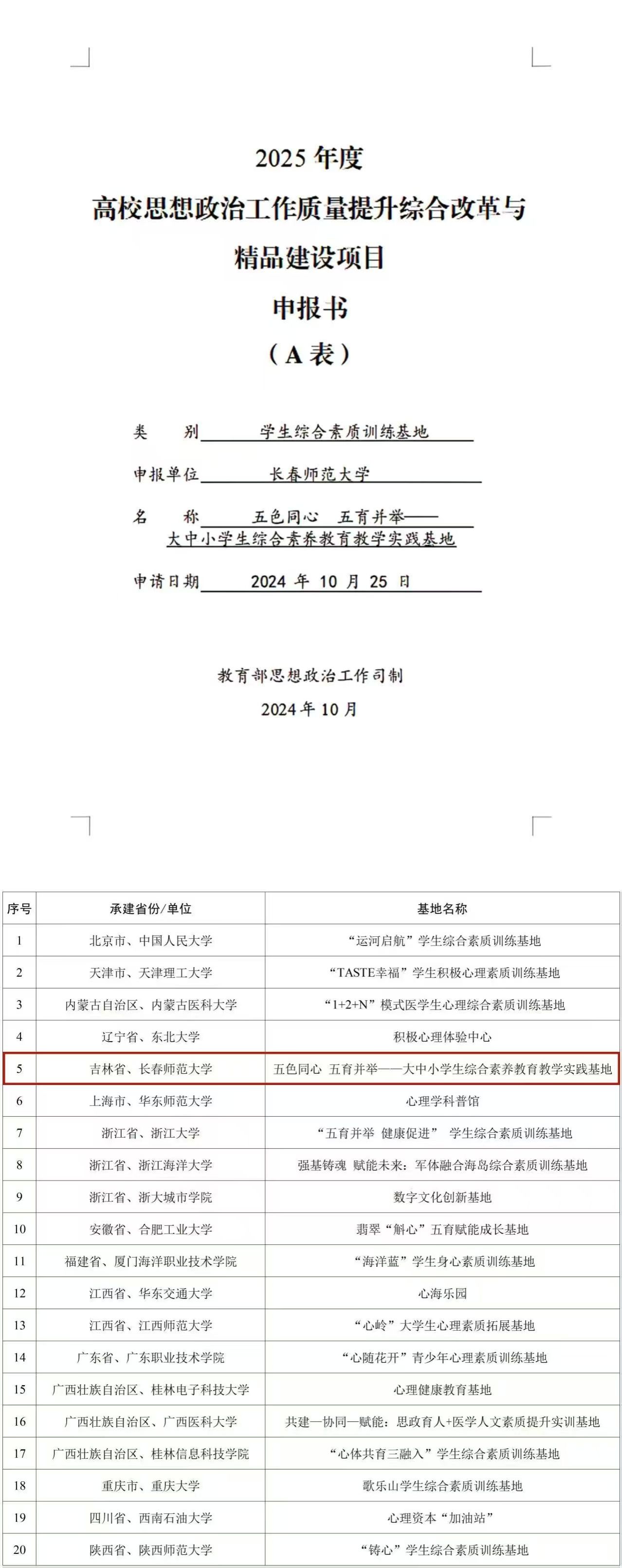 近日,教育部公布2025年度高校思想政治工作质量提升综合改革与精品建设项目遴选结果,我校“‘五色同心 五育并举’——大中小学生综合素养教育教学实践基地”项目成功获批“2025年度学生综合素质训练基地”项目。这是我校首次获批该类项目,也是吉林省唯一获批单位。