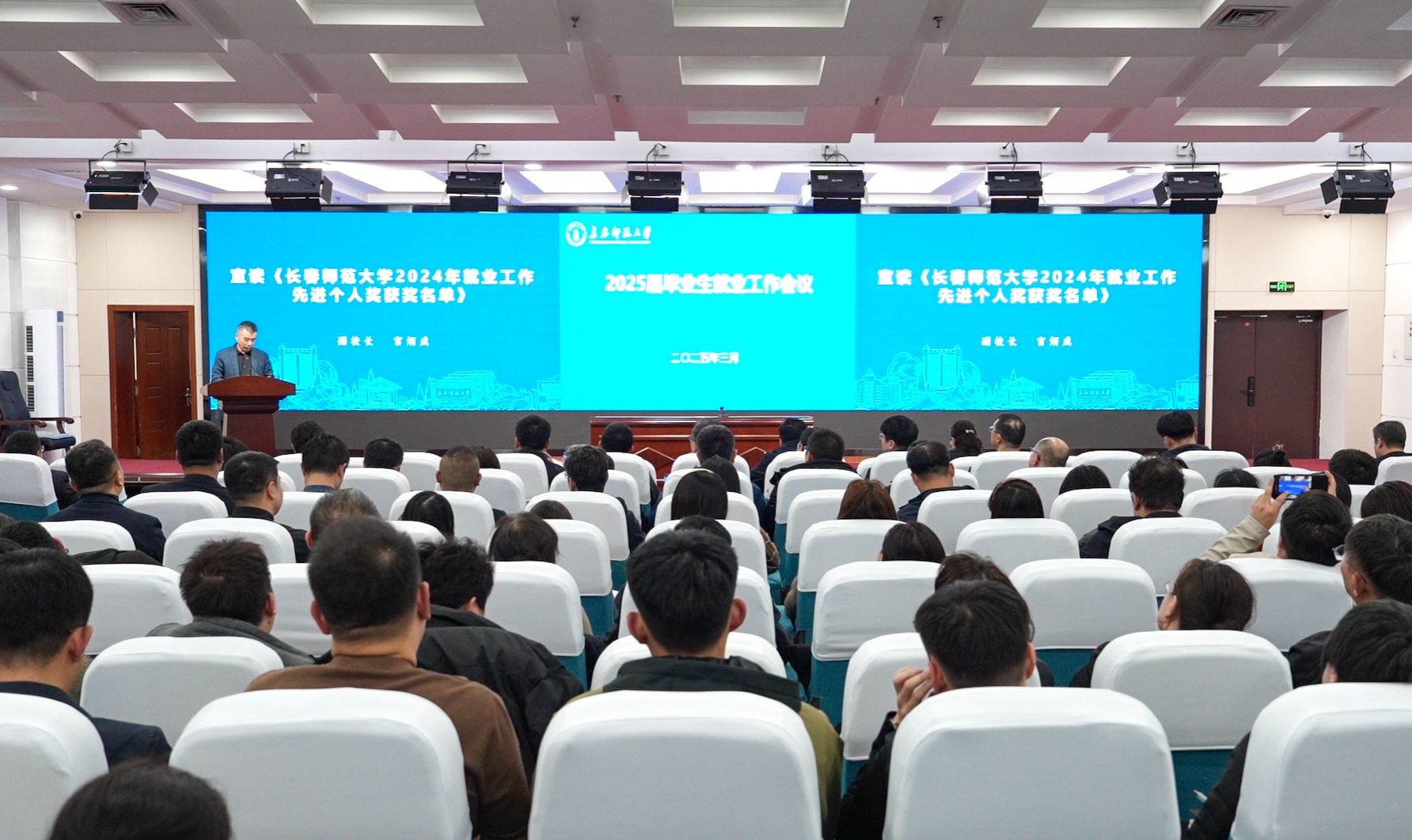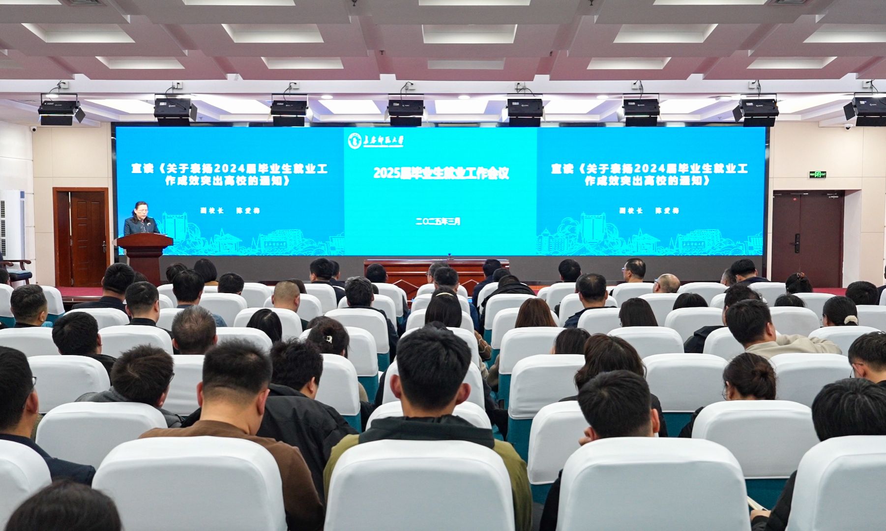 副校长陈爱梅宣读《关于表扬2024届毕业生就业工作成效突出高校的通知》。
