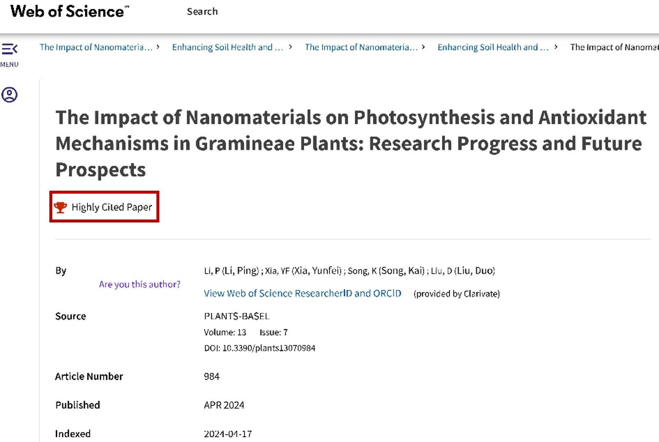 近日,由我校生命科学学院2022级硕士研究生李萍为第一作者,宋凯教授与刘多教授为通讯作者共同完成的论文《The Impact of Nanomaterials on Photosynthesis and Antioxidant Mechanisms in Gramineae Plants: Research Progress and Future Prospects》,在国际期刊PLANTS-BASEL发表,入选ESI全球TOP 1%高被引论文。该论文发表,标志着我校生物学学科建设、学术影响力与竞争力的不断提升,进一步促进了学科建设高质量发展。