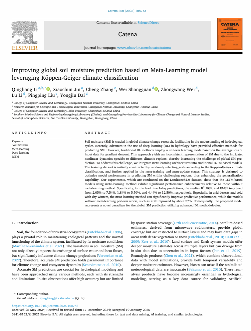计算机科学与技术学院(软件学院)副院长李清亮教授在《Catena》Sci一区发表论文《Improving global soil moisture prediction based on Meta-Learning model leveraging K¨ oppen-Geiger climate classification》。